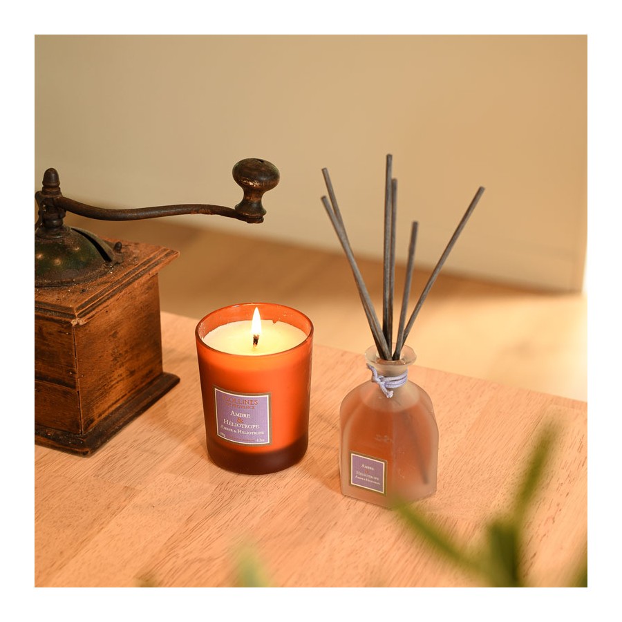 La bougie parfumée Collines de Provence « Ambre & Héliotrope », aux lignes sobres et intemporelles, créera une douce ambiance, lumineuse et délicieusement parfumée. Formulée à base de cire végétale, intégrants des ingrédients naturels au cœur d’un complexe parfumé unique créée par notre nez à Grasse, elle saura vous séduire autant par sa robe que son parfum.