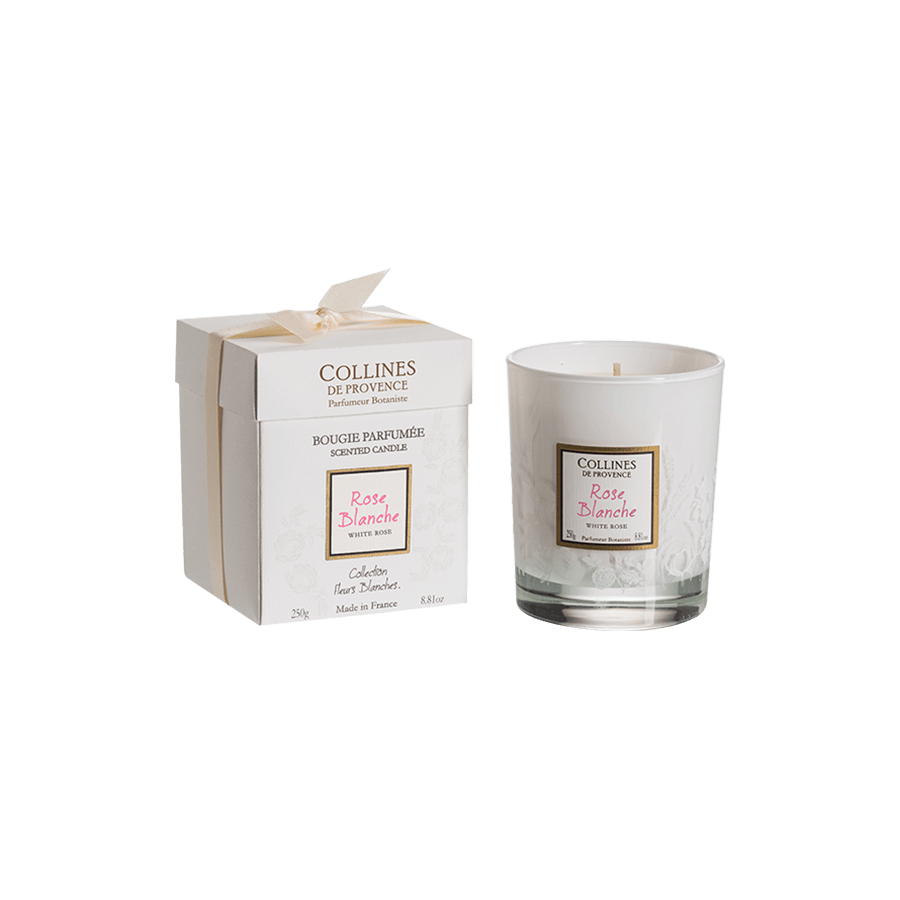 Créez une ambiance chaleureuse et parfumée en allumant la bougie à la cire végétale Rose Blanche.