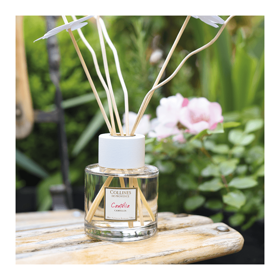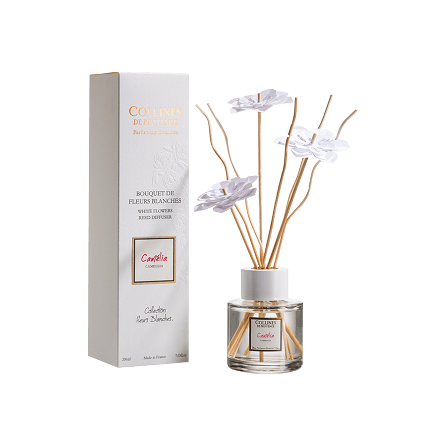 Laissez-vous charmer par l'élégance de notre Bouquet Aromatique décoré de fleurs. Ses tiges de rotin naturelles diffusent en continu des notes de Camélia dans votre intérieur.