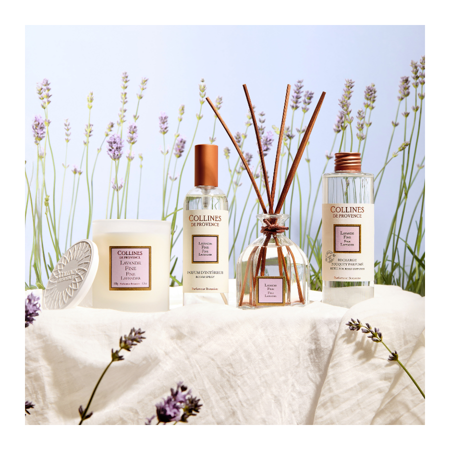 Notre Bouquet Parfumé Collines de Provence au flacon exclusif décorera et parfumera votre intérieur. Disposez les tiges de rotin de deux couleurs dans votre bouquet parfumé pour une diffusion continu de délicats parfums.