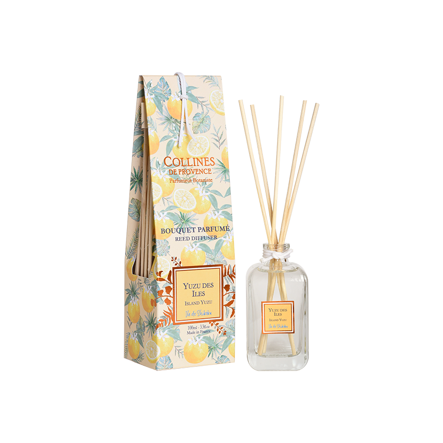 Véritable objet de décoration, le bouquet parfumé Yuzu des Iles Collines de Provence est fabriqué dans notre manufacture de Mane en Haute Provence : un savoir-faire 100% Français, 100% Provence depuis plus de 30 ans.
