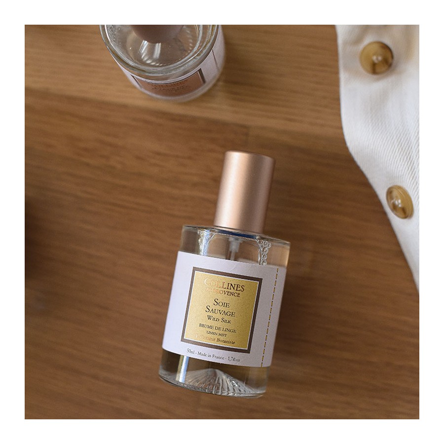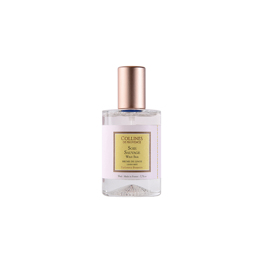 La brume de linge Soie Sauvage parfume délicatement votre linge d’une senteur fleurie et musquée. Sa formule est spécialement conçue pour une utilisation sur le linge de maison.
