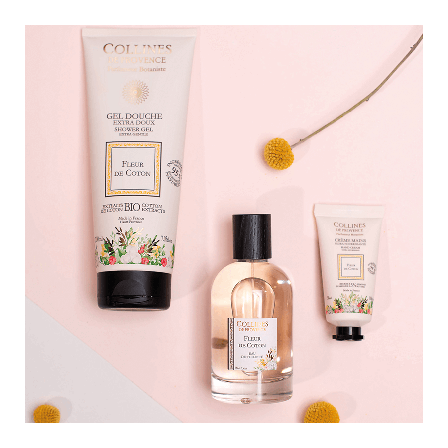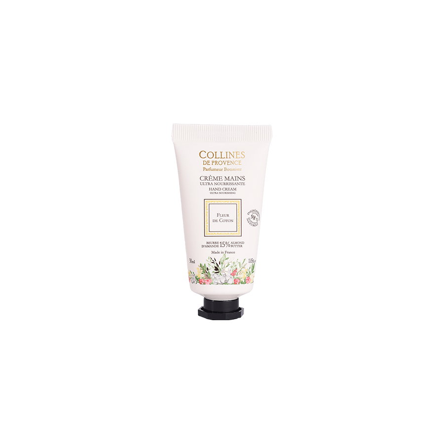 Enrichie en beurre d’amande de Provence (15%), la crème mains Fleur de Coton Collines de Provence, à la texture onctueuse et fondante, associe les vertus adoucissantes, réparatrices et nourrissantes du beurre d’amande douce.
