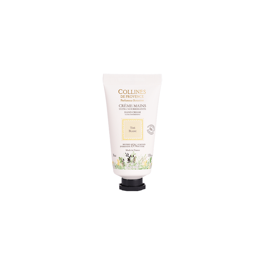 Enrichie en beurre d’amande de Provence (15%), la crème mains Thé Blanc Collines de Provence, à la texture onctueuse et fondante, associe les vertus adoucissantes, réparatrices et nourrissantes du beurre d’amande douce.