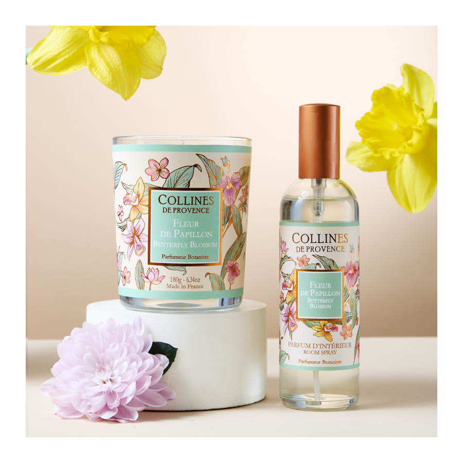 Lassen Sie sich von unserem Raumspray Schmetterlingsblume verführen, einem einzigartigen Duft mit floralen, orientalischen und fruchtigen Akzenten. Sorgfältig gefertigt in unseren Werkstätten in der Haute-Provence, verbreitet es eine warme und elegante Atmosphäre.