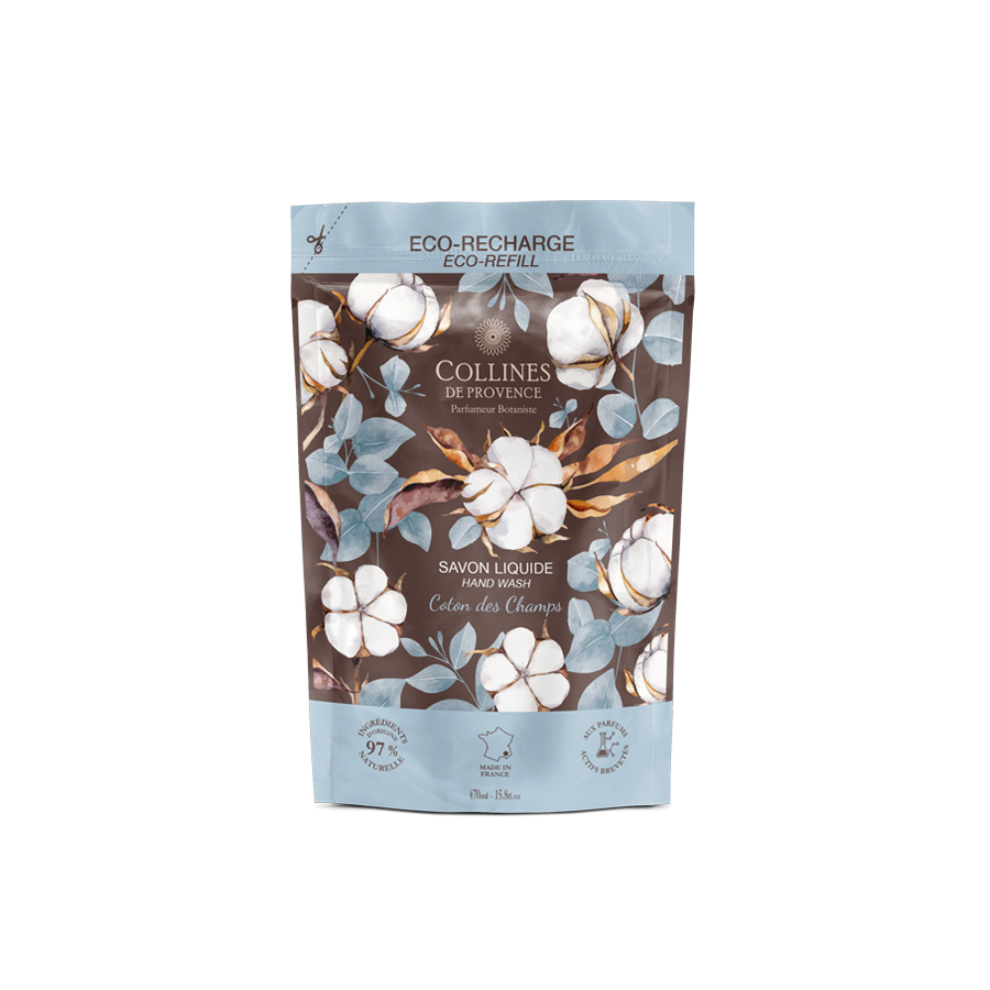 L'Eco-Recharge Savon Liquide Coton des Champs est fabriqué avec une formule à base de 97% d'ingrédients naturels, incluant des huiles végétales et de l'extrait d'Amande Douce pour une peau nourrie et protégée. Pratique et économique, elle permet de recharger facilement votre savon liquide.