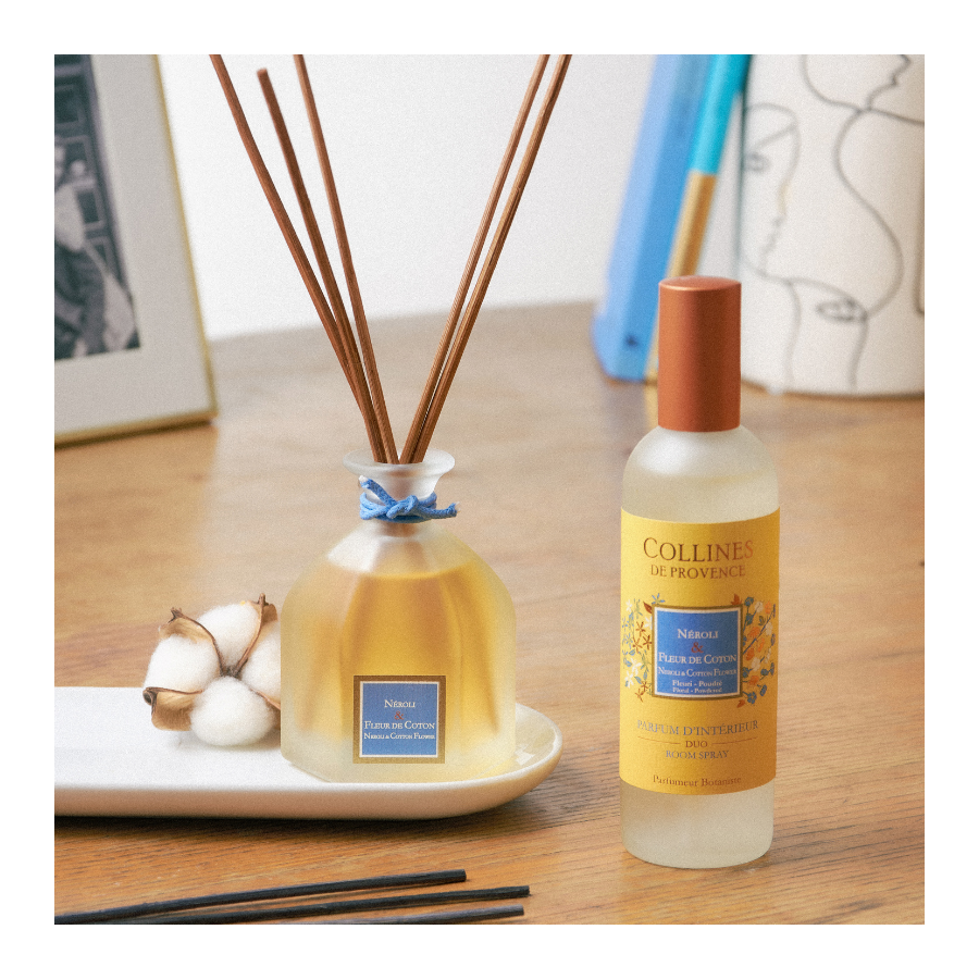 Découvrez notre Parfum d'Intérieur Néroli & Fleur de Coton aux notes fleuries et poudrées, fabriqué à la main dans nos ateliers en Haute-Provence.