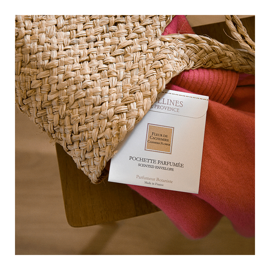 Discover the floral and powdered scent of the Cashmere Flower scented pouch, made in the heart of the Alpes de Haute-Provence in the village of Mane. Its fragrance with sweet and powdered notes will pleasantly perfume your laundry, your cupboards, drawers and handbags.