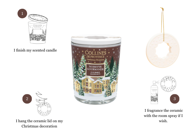 Discover the new Noël Noisette Gourmande scented candle, crafted in our Haute Provence workshops: Hand-poured candle Grasse fragrance Wooden wick that crackles like a fireplace Ceramic cap with lantern design Sparkling Christmas village