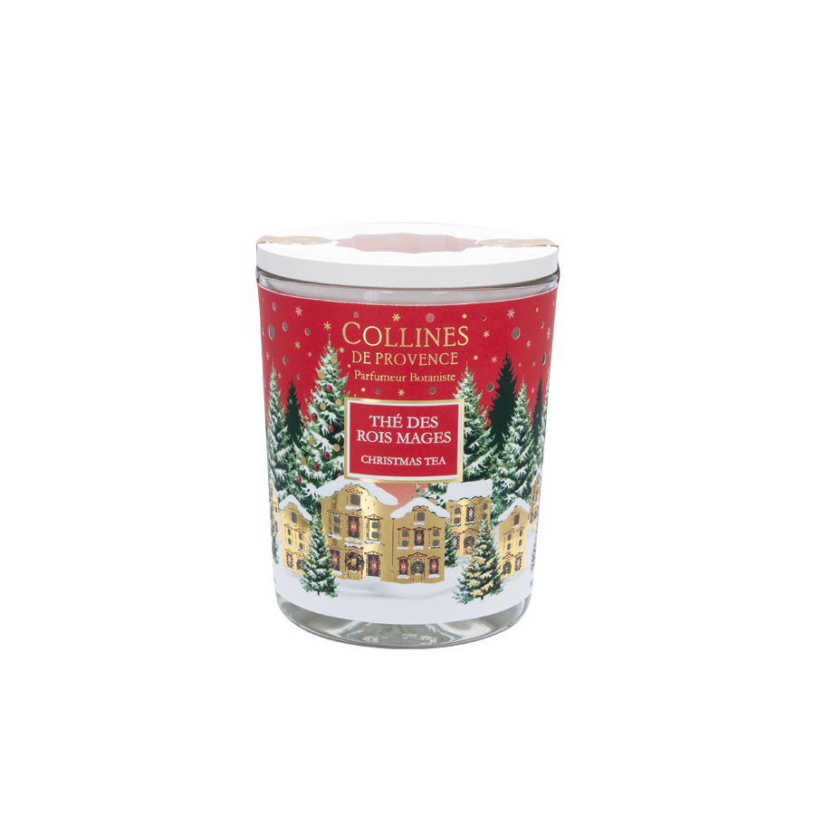 Discover the new Noël Thé des Rois Mages scented candle, hand-poured in our Haute-Provence workshops: Hand-poured candle Fragrance from Grasse Wooden wick that crackles like a fireplace Ceramic lantern lid Sparkling Christmas village