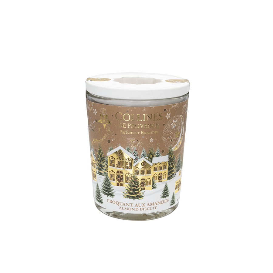 Immerse yourself in the delights of the festive season with the Croquant aux Amandes 180g scented candle, handcrafted in Haute Provence. Its beige and brown design, enhanced with fine gold detailing evoking a starry sky, adds a touch of elegance to the festive season. Its refined ceramic cap, crackling wooden wick and openwork label allowing the flame to sparkle make it a warm decorative object. Its fragrance, inspired by the essential almond of the 13 Provençal desserts, is a true invitation to a moment of simple and comforting pleasure.